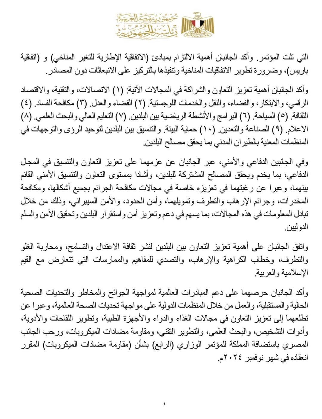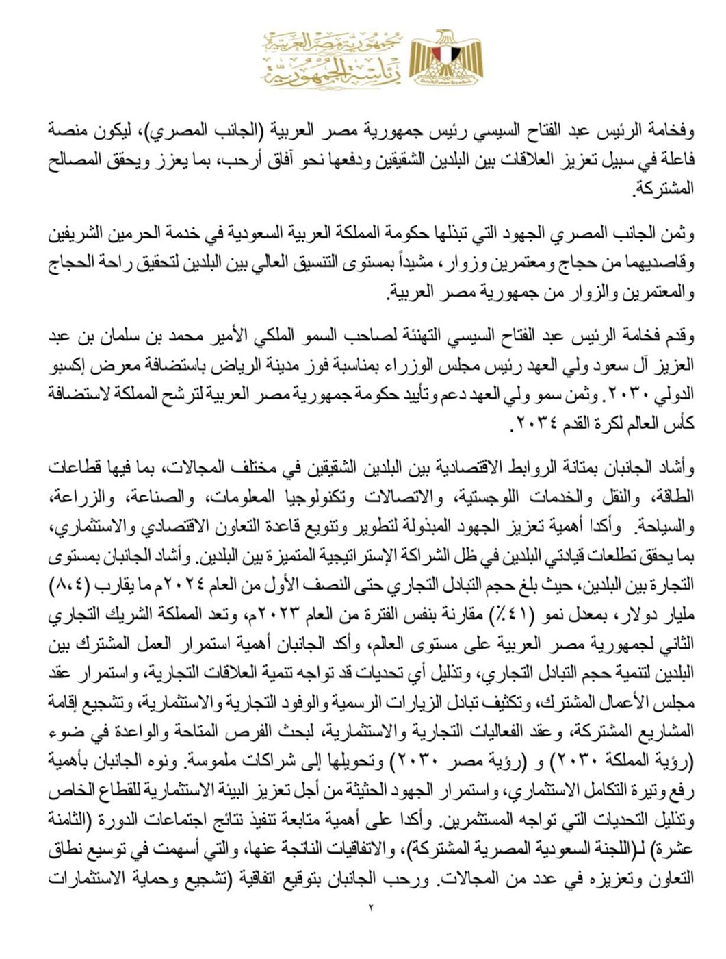 انطلاقًا من الروابط التاريخية الراسخة والأواصر الأخوية الوثيقة التي تجمع بين قيادتي المملكة العربية السعودية وجمهورية مصر العربية وشعبيهما الشقيقين، واستجابةً لدعوة من فخامة رئيس جمهورية مصر العربية/ عبدالفتاح السيسي، قام صاحب السمو الملكي الأمير محمد بن سلمان بن عبدالعزيز آل سعود ولي العهد رئيس مجلس الوزراء بزيارة رسمية لجمهورية مصر العربية بتاريخ 12 / 4 / 1446هـ الموافق 15 / 10 / 2024م.