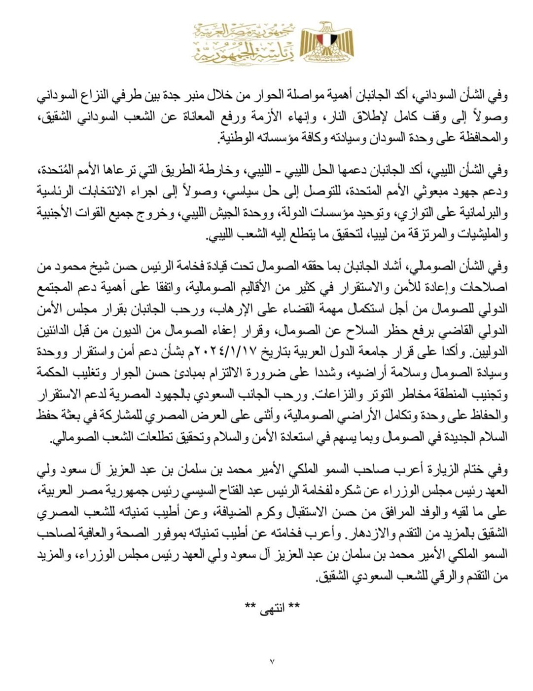 وفي الشأن الصومالي، أشاد الجانبان بما حققه الصومال تحت قيادة فخامة الرئيس حسن شيخ محمود من اصلاحات وإعادة للأمن والاستقرار في كثير من الأقاليم الصومالية، واتفقا على أهمية دعم المجتمع الدولي للصومال من أجل استكمال مهمة القضاء على الإرهاب، ورحب الجانبان بقرار مجلس الأمن الدولي القاضي برفع حظر السلاح عن الصومال، وقرار إعفاء الصومال من الديون من قبل الدائنين الدوليين. وأكدا على قرار جامعة الدول العربية بتاريخ 17 / 1 / 2024م، بشأن دعم أمن واستقرار ووحدة وسيادة الصومال وسلامة أراضيه، وشددا على ضرورة الالتزام بمبادئ حسن الجوار وتغليب الحكمة وتجنيب المنطقة مخاطر التوتر والنزاعات. ورحب الجانب السعودي بالجهود المصرية لدعم الاستقرار والحفاظ على وحدة وتكامل الأراضي الصومالية، وأثنى على العرض المصري للمشاركة في بعثة حفظ السلام الجديدة في الصومال وبما يسهم في استعادة الأمن والسلام وتحقيق تطلعات الشعب الصومالي.