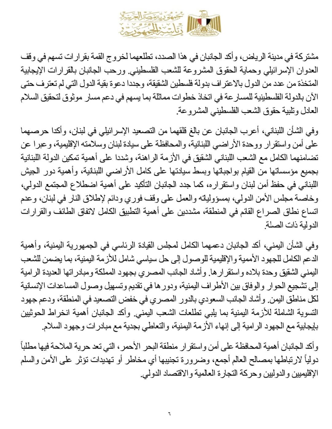 وفي الشأن اليمني، أكد الجانبان دعمهما الكامل لمجلس القيادة الرئاسي في الجمهورية اليمنية، وأهمية الدعم الكامل للجهود الأممية والإقليمية للوصول إلى حل سياسي شامل للأزمة اليمنية، بما يضمن للشعب اليمني الشقيق وحدة بلاده واستقرارها. وأشاد الجانب المصري بجهود المملكة ومبادراتها العديدة الرامية إلى تشجيع الحوار والوفاق بين الأطراف اليمنية، ودورها في تقديم وتسهيل وصول المساعدات الإنسانية لكل مناطق اليمن. وأشاد الجانب السعودي بالدور المصري في خفض التصعيد في المنطقة، ودعم جهود التسوية الشاملة للأزمة اليمنية بما يلبي تطلعات الشعب اليمني. وأكد الجانبان أهمية انخراط الحوثيين بإيجابية مع الجهود الرامية إلى إنهاء الأزمة اليمنية، والتعاطي بجدية مع مبادرات وجهود السلام.