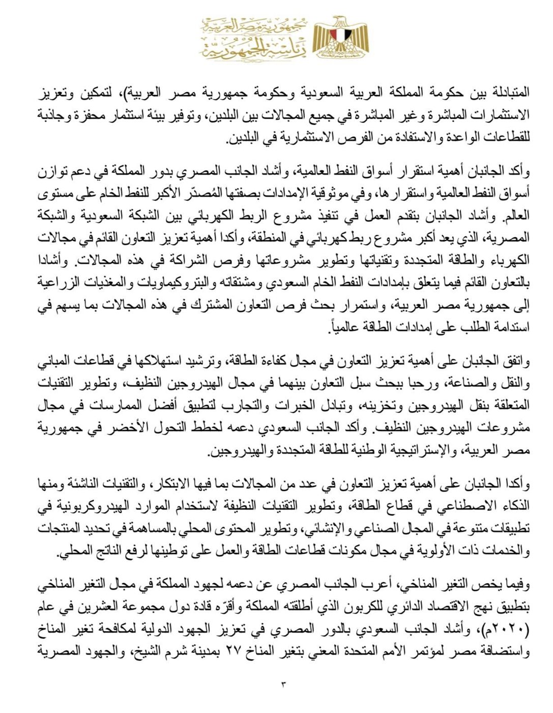 وأشاد الجانبان بما حققته زيارة صاحب السمو الملكي الأمير محمد بن سلمان بن عبدالعزيز آل سعود ولي العهد رئيس مجلس الوزراء لجمهورية مصر العربية خلال المدة 21 - 22 / 11 / 1443هـ الموافق 20 - 21 / 6 / 2022م، وزيارة فخامة الرئيس عبدالفتاح السيسي رئيس جمهورية مصر العربية للمملكة العربية السعودية بتاريخ 5 / 8 / 1443هـ الموافق 8 / 3 / 2022م، من نتائج إيجابية أسهمت في توسيع نطاق التعاون وتنمية العلاقات بين البلدين.