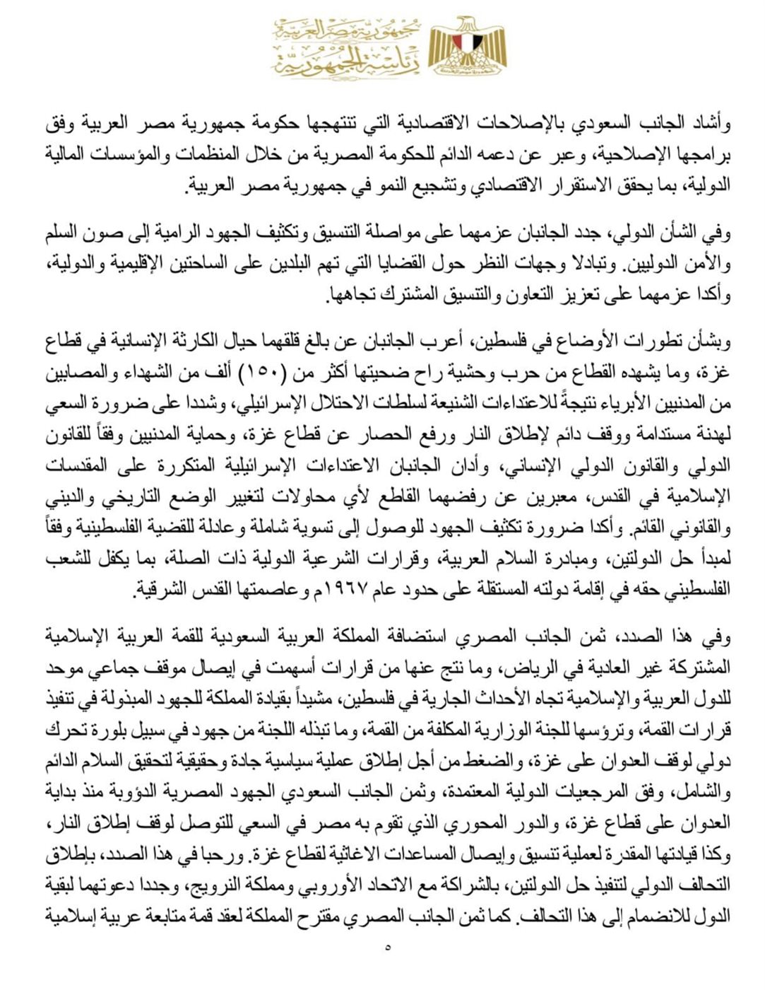 وفي هذا الصدد، ثمن الجانب المصري استضافة المملكة العربية السعودية للقمة العربية الإسلامية المشتركة غير العادية في الرياض، وما نتج عنها من قرارات أسهمت في إيصال موقف جماعي موحد للدول العربية والإسلامية تجاه الأحداث الجارية في فلسطين، مشيدًا بقيادة المملكة للجهود المبذولة في تنفيذ قرارات القمة، وترؤسها للجنة الوزارية المكلفة من القمة، وما تبذله اللجنة من جهود في سبيل بلورة تحرك دولي لوقف العدوان على غزة، والضغط من أجل إطلاق عملية سياسية جادة وحقيقية لتحقيق السلام الدائم والشامل، وفق المرجعيات الدولية المعتمدة، وثمن الجانب السعودي الجهود المصرية الدؤوبة منذ بداية العدوان على قطاع غزة، والدور المحوري الذي تقوم به مصر في السعي للتوصل لوقف إطلاق النار، وكذا قيادتها المقدرة لعملية تنسيق وإيصال المساعدات الاغاثية لقطاع غزة. ورحبا في هذا الصدد، بإطلاق التحالف الدولي لتنفيذ حل الدولتين، بالشراكة مع الاتحاد الأوروبي ومملكة النرويج، وجددا دعوتهما لبقية الدول للانضمام إلى هذا التحالف. كما ثمن الجانب المصري مقترح المملكة لعقد قمة متابعة عربية إسلامية مشتركة في مدينة الرياض، وأكد الجانبان في هذا الصدد، تطلعهما لخروج القمة بقرارات تسهم في وقف العدوان الإسرائيلي وحماية الحقوق المشروعة للشعب الفلسطيني. ورحب الجانبان بالقرارات الإيجابية المتخذة من عدد من الدول بالاعتراف بدولة فلسطين الشقيقة، وجددا دعوة بقية الدول التي لم تعترف حتى الآن بالدولة الفلسطينية للمسارعة في اتخاذ خطوات مماثلة بما يسهم في دعم مسار موثوق لتحقيق السلام العادل وتلبية حقوق الشعب الفلسطيني المشروعة.