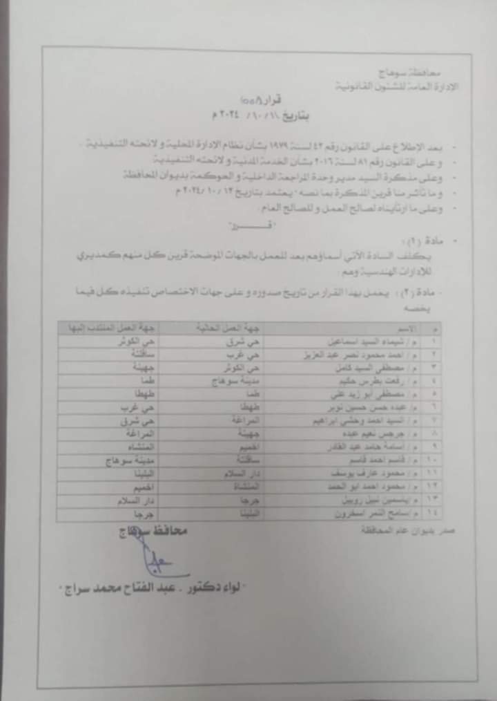 محافظ سوهاج إجراء حركة تنقلات بجميع مديري الإدارات الهندسية على مستوى المحافظة