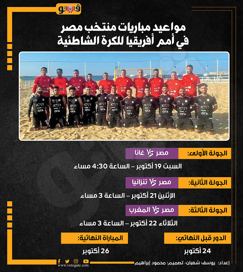 مواعيد مباريات منتخب مصر في أمم أفريقيا للكرة الشاطئية (إنفوجراف) السبت 19/أكتوبر/2024 - 04:12 م 10/19/2024 4:12:07 PM منتخب الشاطئية يستعد لبطولة أمم إفريقيا، فيتو يوسف شعبان شارك طباعة 18 حجم الخط شارك طباعة امم افريقيا للكرة الشاطئية مدينة الغردقة منتخب مصر غانا تنزانيا المغرب