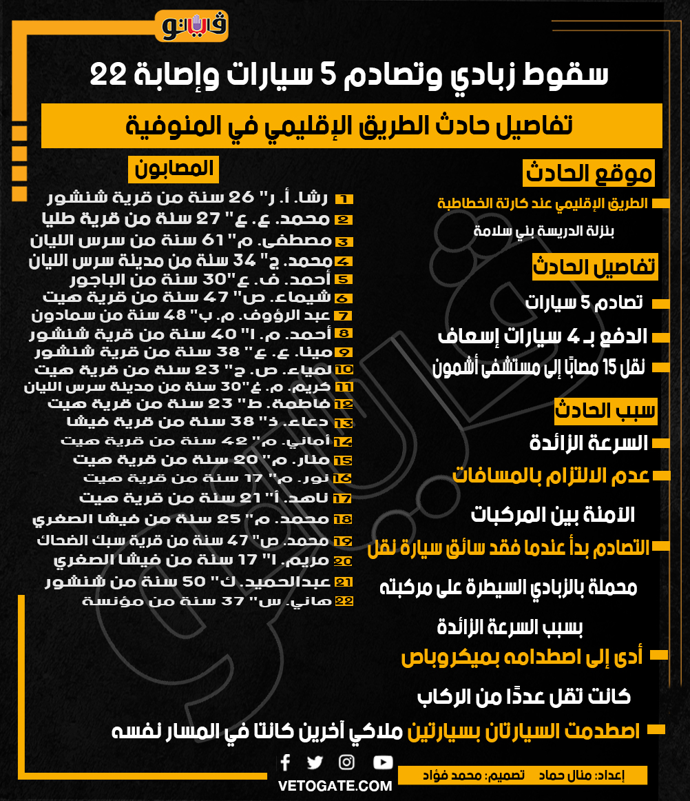 سقوط زبادي وتصادم 5 سيارات وإصابة 22.. تفاصيل حادث الطريق الإقليمي في المنوفية (إنفوجراف) الخميس 17/أكتوبر/2024 - 09:38 ص 10/17/2024 9:38:17 AM تصادم خمس سيارات وإصابة ١٥ شخصًا في المنوفية، فيتو منال حماد شارك طباعة 18 حجم الخط شارك طباعة حادث تصادم سيارة الطريق الاقليمى كارتة الخطاطبة