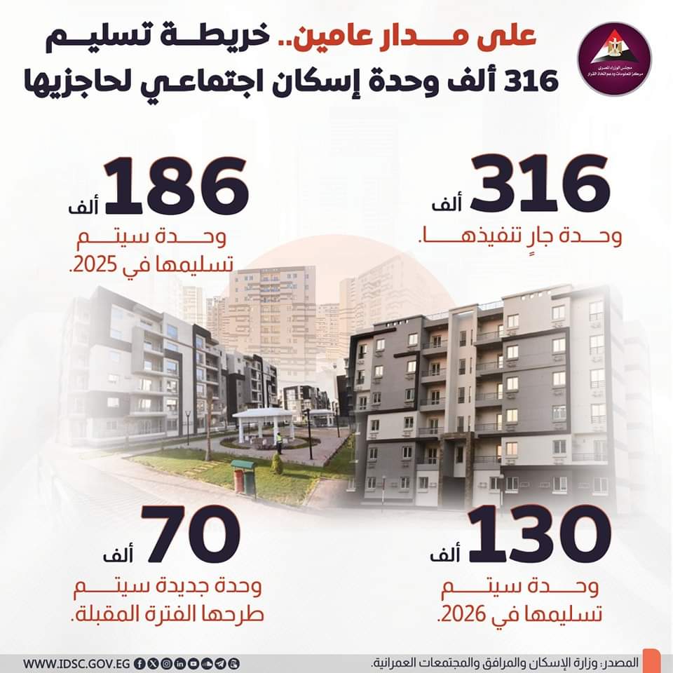 وقال وزير الإسكان، إنه جارٍ تنفيذ 316 ألف وحدة، سيتم تسليم المواطنين 186 ألف وحدة منها خلال عام 2025، بالإضافة إلى 130 ألف وحدة سكنية خلال عام 2026، ومن المقرر طرح 70 ألف وحدة سكنية في المرحلة الحالية.