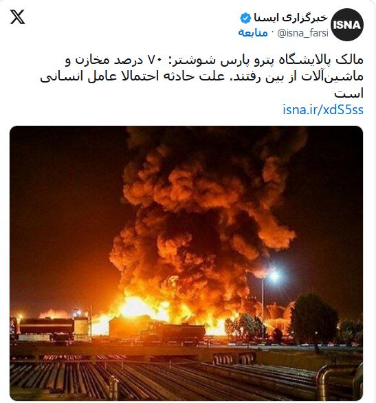 ومساء الأربعاء، نشرت وسائل إعلام رسمية إيرانية مشاهد عن حجم الدمار والأضرار التي لحقت بالمصفاة.