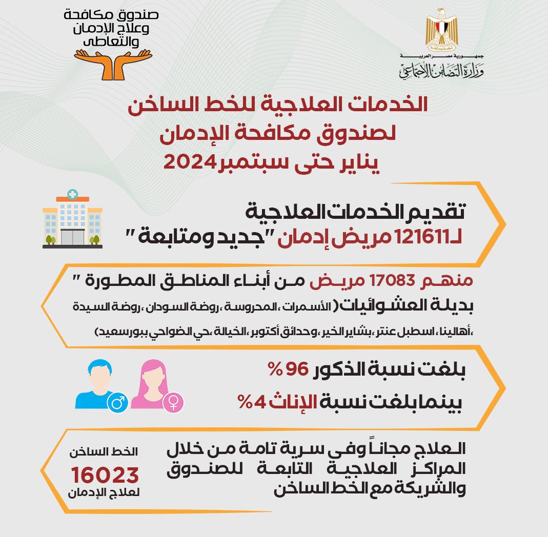 نشر صندوق مكافحة وعلاج الإدمان والتعاطي برئاسة الدكتورة مايا مرسى وزيرة التضامن الاجتماعي ورئيس مجلس إدارة الصندوق انفو جراف على الصفحة الرسمية للصندوق، يتضمن مجهودات الخط الساخن للصندوق " 16023" حيث تم تقديم الخدمات العلاجية خلال الفترة من يناير حتى سبتمبر 2024 لعدد 121 ألف و611 مريض " جديد ومتابعة "منهم 17083 مريض من أبناء المناطق المطورة " بديلة العشوائيات، الأسمرات، المحروسة، روضة السودان، روضة السيدة، أهالينا، اسطبل عنتر، الخيالة، بشاير الخير، حدائق أكتوبر".