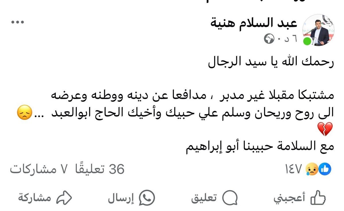 وقال عبد السلام هنية في منشور على حسابه بموقع التواصل الاجتماعى فيسبوك اليوم، "رحمك الله يا سيد الرجال.. مشتبكا مقبلا غير مدبر، مدافعا عن دينه ووطنه وعرضه إلى روح وريحان وسلم على حبيبك وأخيك الحاج أبو العبد.. مع السلامة حبيبنا أبو إبراهيم".