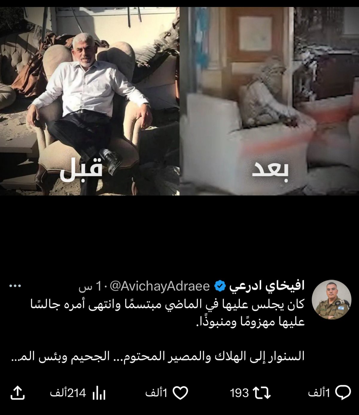 أعلن المتحدث الرسمي باسم جيش الاحتلال الإسرائيلي مساء الخميس اغتيال زعيم حركة حماس يحيى السنوار.