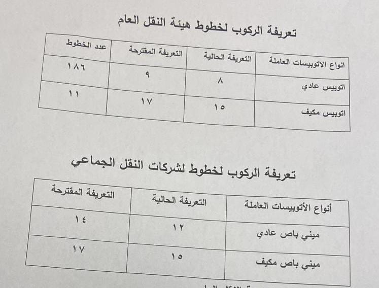 وفيما يلى أسعار تعريفة الركوب بأتوبيسات النقل العام: