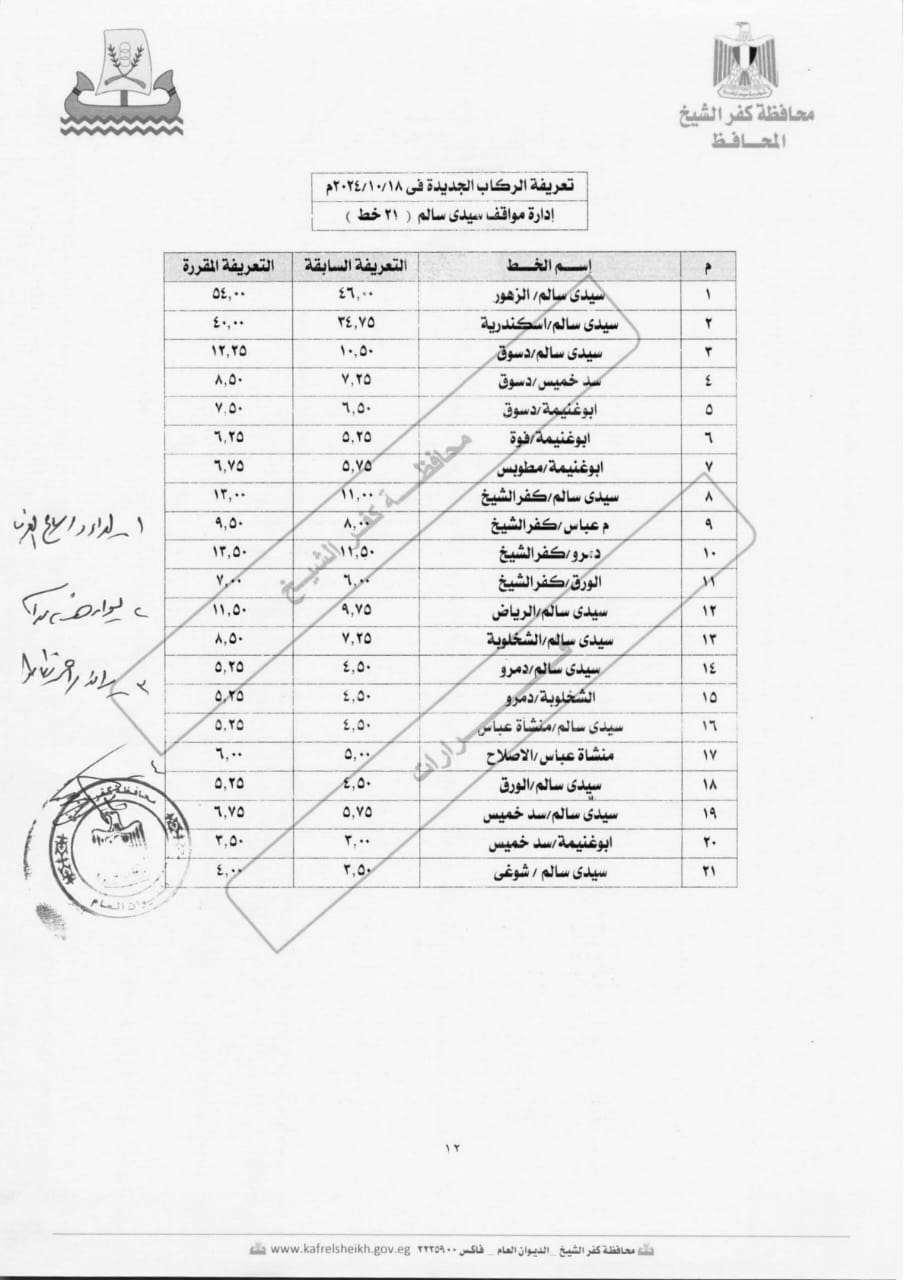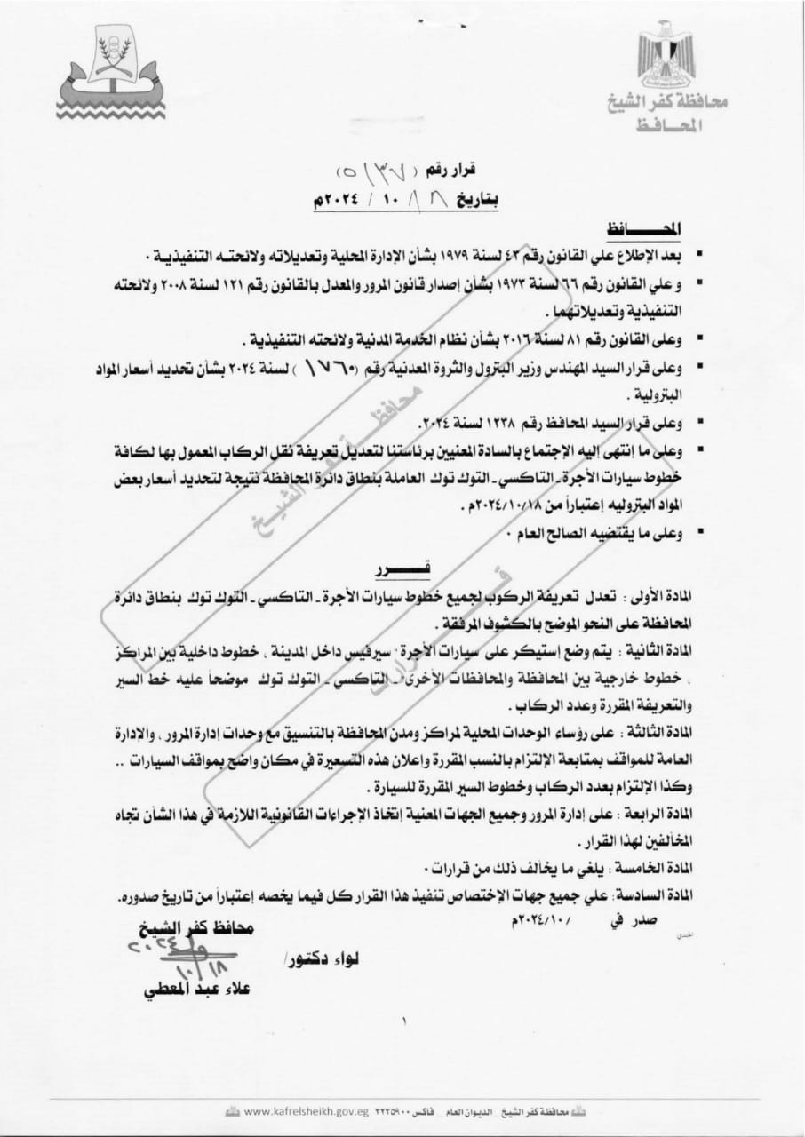 اعتمد اللواء دكتور علاء عبد المعطي، محافظ كفر الشيخ، اليوم الجمعة، التعريفة الجديدة لنقل الركاب عقب قرار لجنة التسعير التلقائي للمنتجات البترولية المعنية بوزارة البترول برفع أسعار المنتجات البترولية اعتبارًا من اليوم الجمعة، محذرًا من استغلال المواطنين في تحصيل مبالغ أزيد من التعريفة المقررة.