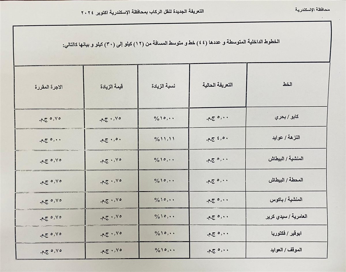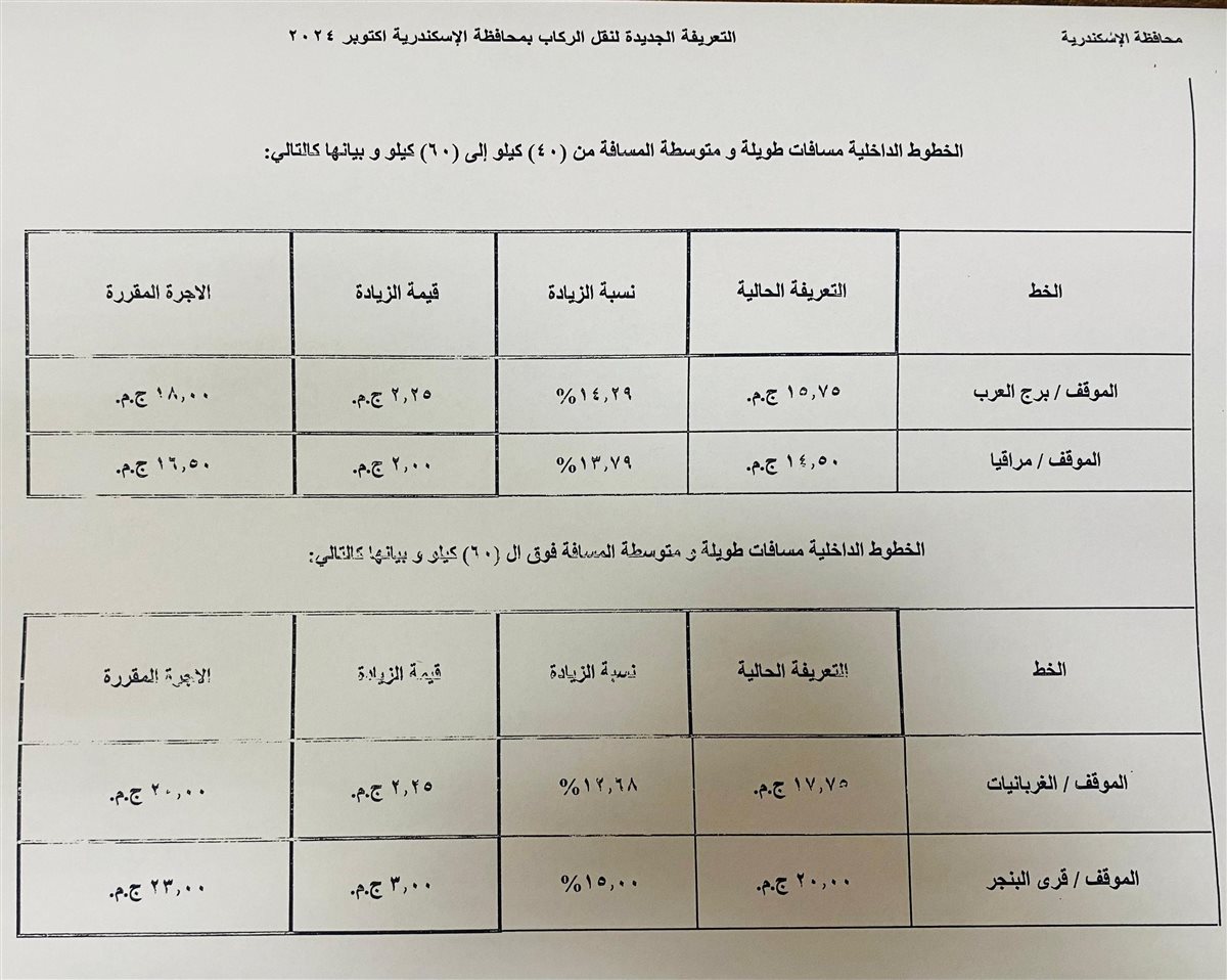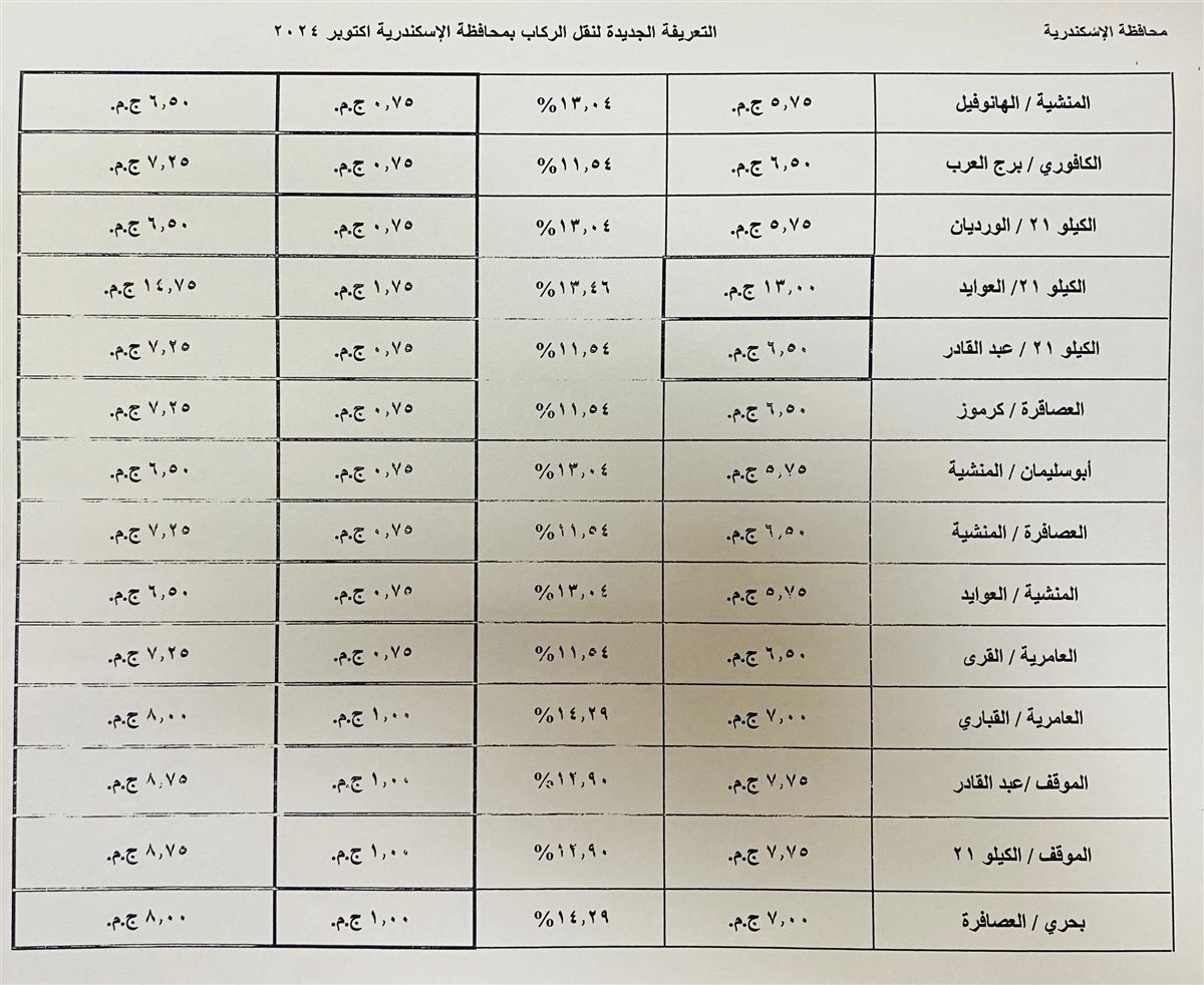 والجدير بالذكر أن محافظة الإسكندرية، اعتمدت تعريفة الركوب الجديدة لسيارات الأجرة لوسائل النقل الداخلية والخارجية والنقل العام بالمحافظة والمقدمة من مشروع محطات الركاب والانتظار ويتم تطبيقها بدءًا من تاريخ الاعتماد طبقًا للجداول المرفقة، وذلك في ضوء قرار لجنة التسعير التلقائي لأسعار المنتجات البترولية بوزارة البترول وتحريك الأسعار لبعض المنتجات