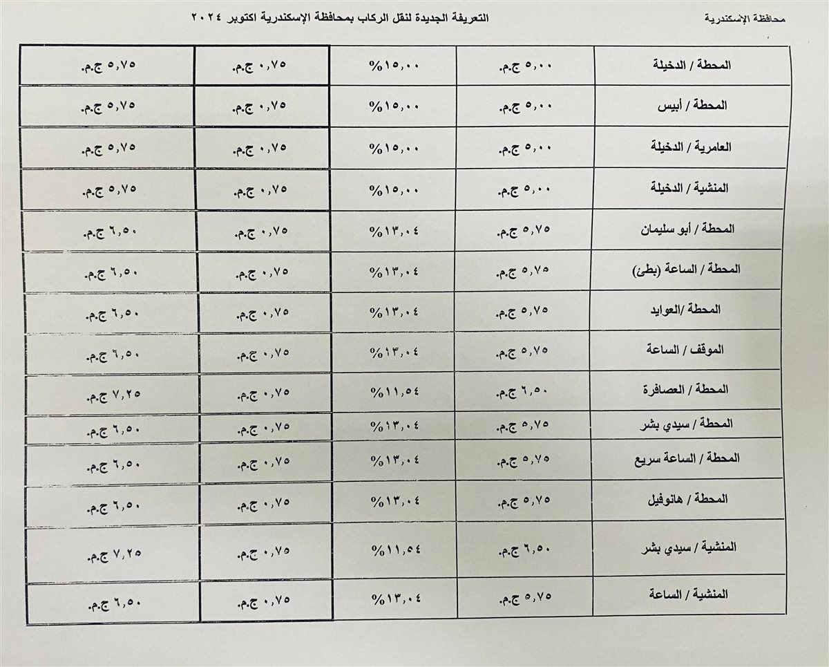 ووجه محافظ الإسكندرية إدارة مشروع محطات الركاب والانتظار، بالالتزام بنشر التعريفة الجديدة بالمواقف والمحطات المختلفة وتعليقها في مكان ظاهر، وإلزام سائق النقل بعمل ملصقات بالتعريفة الجديدة لكل خط سير.