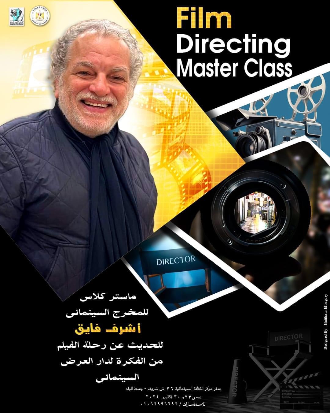 يقيم مركز الثقافة السينمائية، والتابع للمركز القومي للسينما برئاسة مدير التصوير حسين بكر ماستر كلاس للمخرج السينمائي أشرف فايق بعنوان “رحلة الفيلم من الفكرة لدار العرض السينمائي”، وذلك يومي الأربعاء الموافق ٢٣ أكتوبر والأربعاء ٣٠ أكتوبر الجاري.