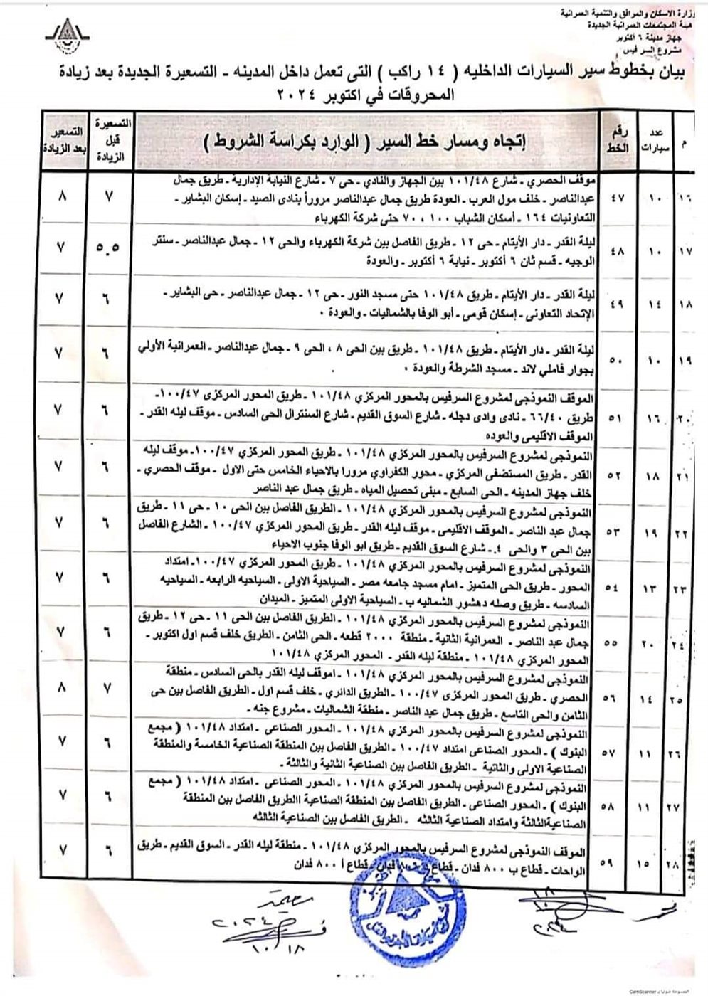 وكلف محافظ الجيزة جهاز السرفيس والأحياء والمراكز بطباعة ملصقات وبانرات بالتعريفة الجديدة والالتزام بنشرها بالمواقف الرسمية وتعليقها في مكان واضح للمواطنين والسائقين.