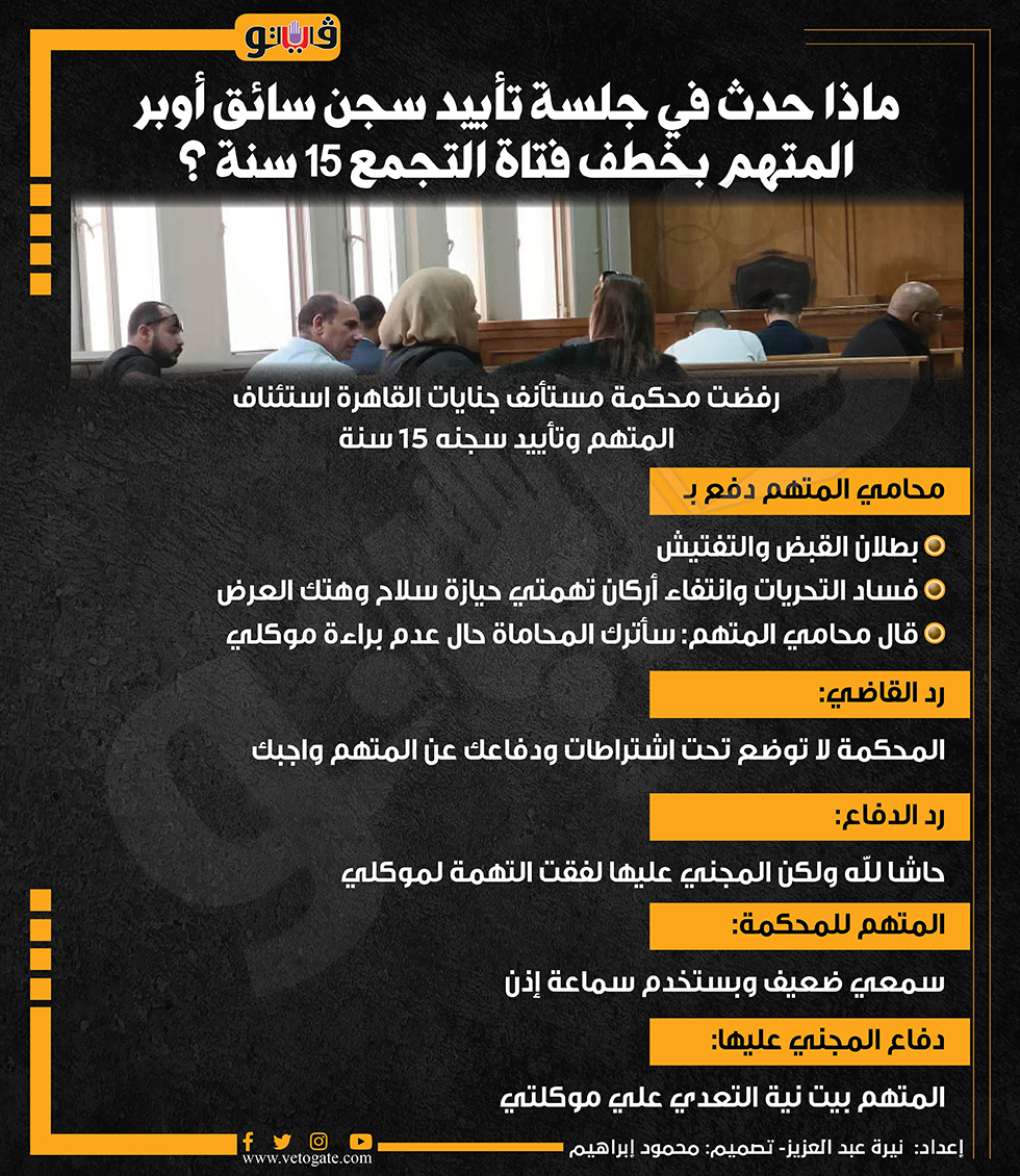 ماذا حدث في جلسة تأييد سجن سائق أوبر المتهم بخطف فتاة التجمع 15 سنة ؟ (انفوجراف) السبت 19/أكتوبر/2024 - 07:33 م 10/19/2024 7:33:28 PM محكمة، فيتو نيرة عبد العزيز شارك طباعة 18 حجم الخط شارك طباعة محكمة مستانف جنايات القاهرة سائق أوبر فتاة التجمع