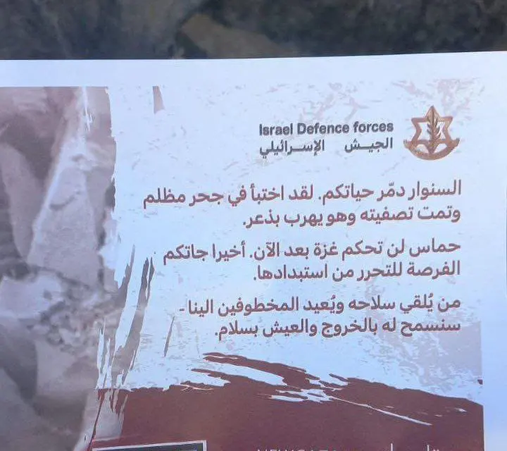 تُظهر جثمان السنوار، إسرائيل تواصل استفزازها بإلقاء منشورات مضللة على غزة