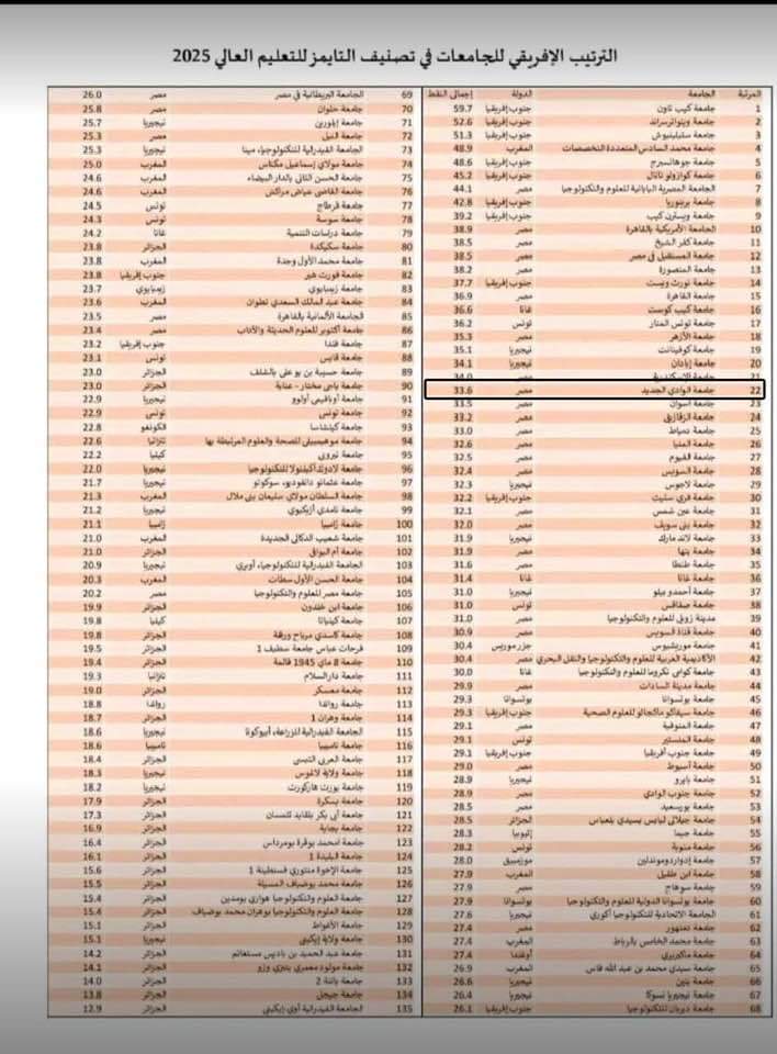 احتلت جامعة الوادي الجديدة المرتبة 22 على مستوى الجامعات الإفريقية، حسب تصنيف تايمز العالمي للتعليم العالي لعام 2025.