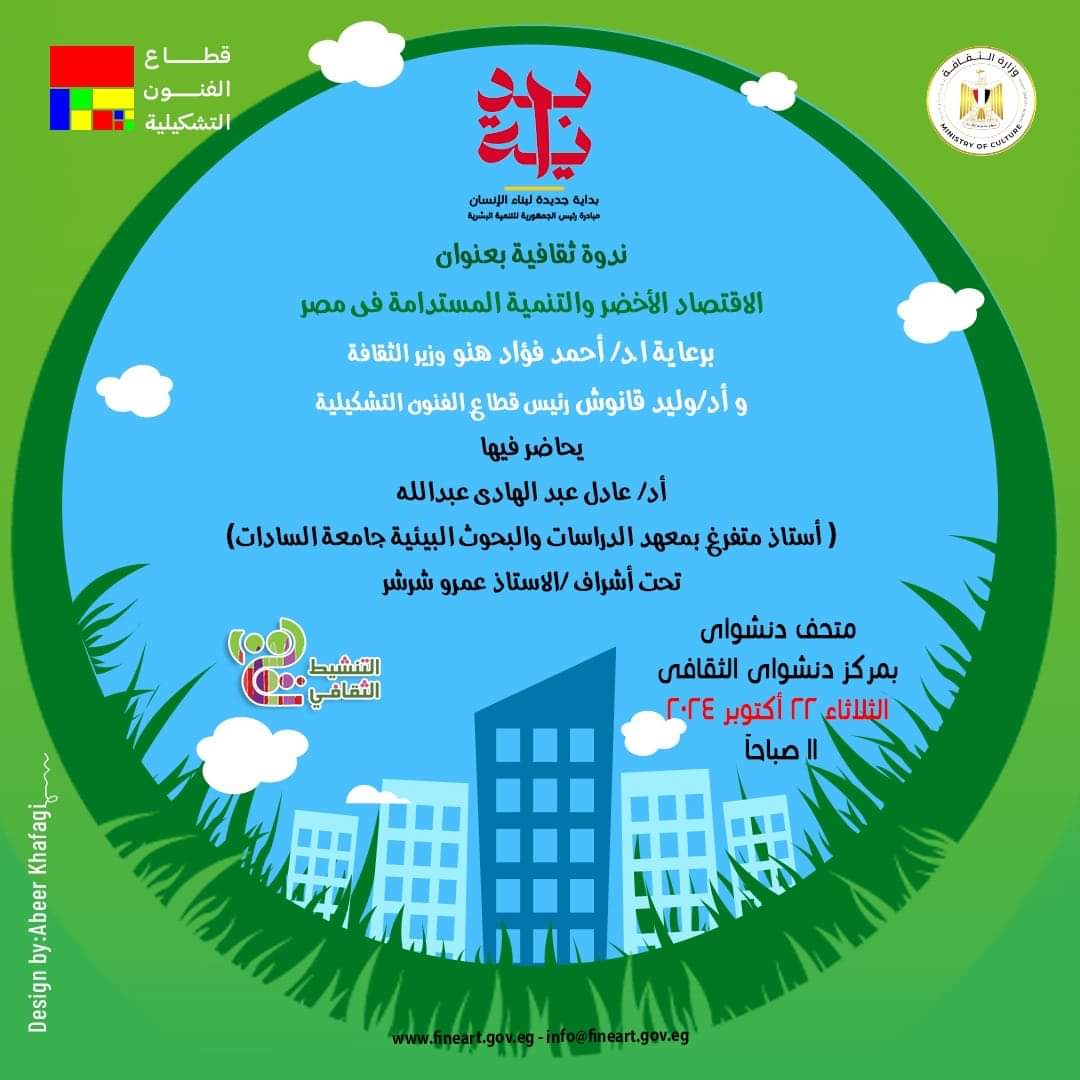 يعقد قطاع الفنون التشكيلية برئاسة الدكتور وليد قانوش ندوة ثقافية بعنوان "الاقتصاد الأخضر والتنمية المستدامة فى مصر" وذلك بمركز دنشواى الثقافي يوم الثلاثاء الموافق 22 أكتوبر 2024م الساعة 11صباحًا بمتحف دنشواى بالمنوفية.