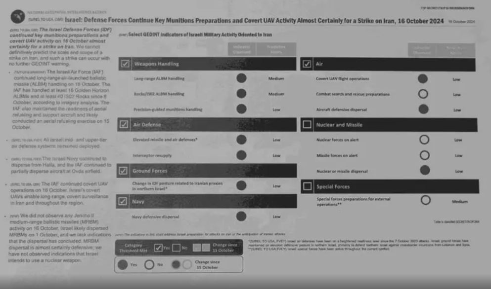وكانت تلك الوثائق التي نسبت إلى وكالة الاستخبارات الأمريكية ووكالة الأمن القومي، كشفت أن إسرائيل تواصل تحريك أصولها العسكرية للقيام بضربة ردًا على الهجوم الصاروخي الباليستي الإيراني في الأول من أكتوبر، بمعاونة "عيونها الخمس" أي الولايات المتحدة وبريطانيا العظمى وكندا ونيوزيلندا وأستراليا.