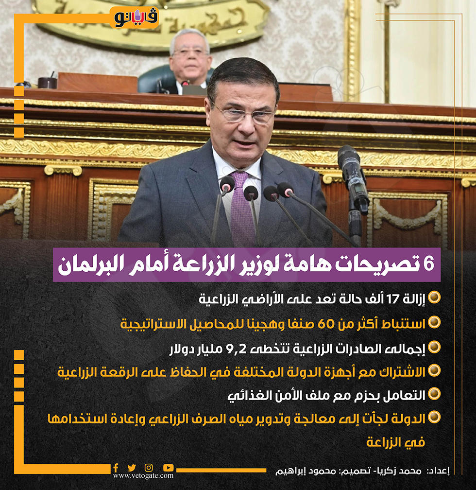 6 تصريحات هامة لوزير الزراعة أمام البرلمان (إنفوجراف) الأحد 20/أكتوبر/2024 - 04:02 م 10/20/2024 4:02:51 PM وزير الزراعة، فيتو محمد زكريا شارك طباعة 18 حجم الخط شارك طباعة إجمالي الصادرات الزراعية الأراضى الزراعية الرقعة الزراعية الصادرات الزراعية ملف الأمن الغذائي مياه الصرف الزراعي وزير الزراعة
