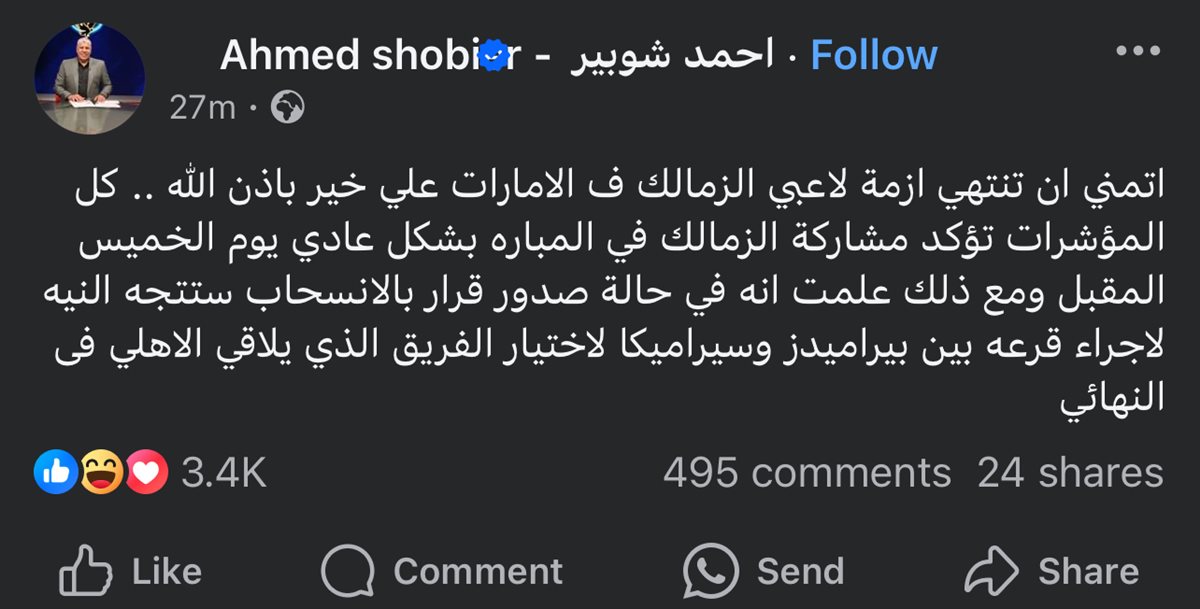 وعلق شوبير عبر صفحته علي فيسبوك حول الأزمة قائلا: “أتمنى أن تنتهي أزمة لاعبي الزمالك في الإمارات على خير بإذن الله، كل المؤشرات تؤكد مشاركة الزمالك في المباراة بشكل عادي يوم الخميس المقبل”.