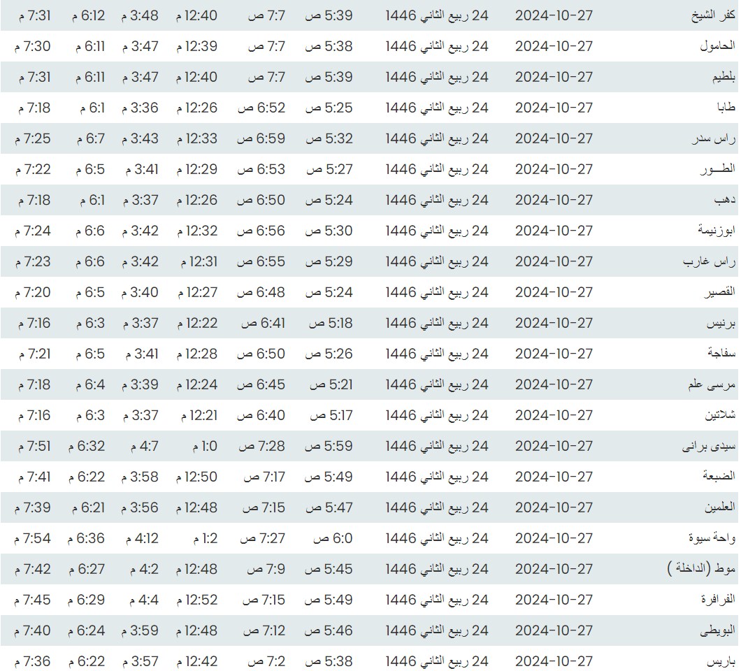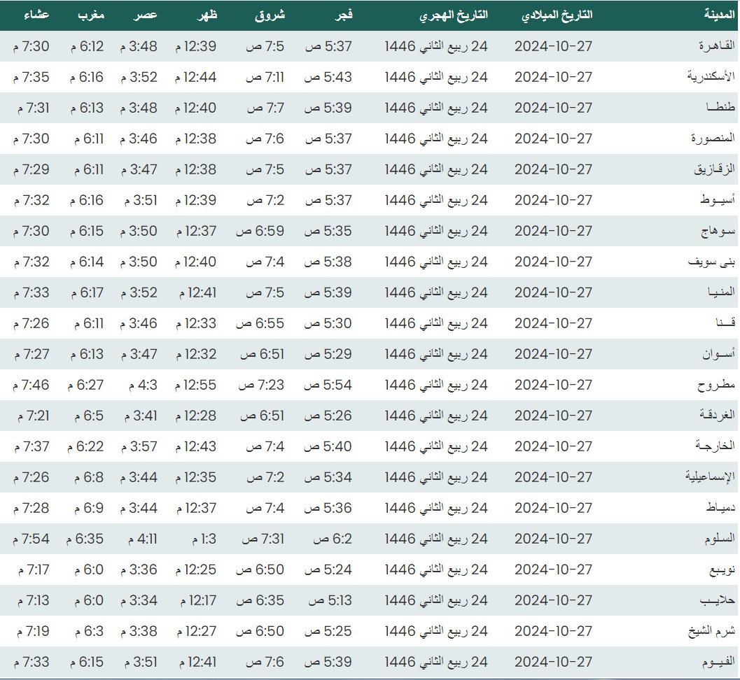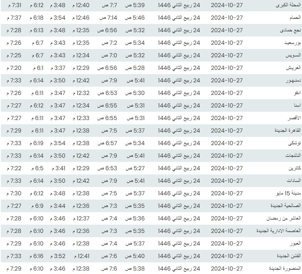 وفيما يلي مواقيت الصلاة، لعدد من مدن ومحافظات الجمهورية من واقع بيانات الهيئة العامة للمساحة