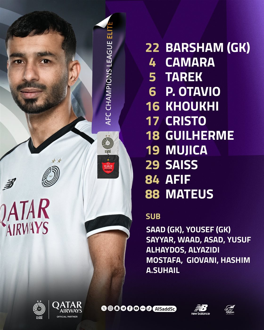 أعلن الإسباني فيليكس سانشيز المدير الفني لنادي السد القطري تشكيل فريقه لمواجهة ضيفه برسبوليس الإيراني، في المباراة التي تجمع الفريقين على ملعب جاسم بن حمد، ضمن منافسات الجولة الثالثة من بطولة دوري أبطال آسيا للنخبة.