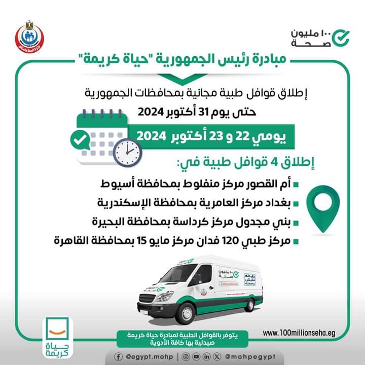 أعلنت وزارة الصحة إطلاق ٤ قوافل طبية ضمن مبادرة رئيس الجمهورية حياة كريمة يومي ٢٢ و٢٣ أكتوبر للكشف والعلاج مجانًا في التخصصات الطبية نساء وولادة - خدمات تنظيم الأسرة - الأطفال والباطنة - الأنف والأذن والعظام - الجراحة - الرمد الأسنان - القلب - الجلدية وخدمات الأشعة والتحاليل.