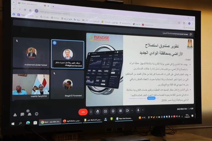 عقد اللواء دكتور محمد الزملوط محافظ الوادي الجديد وحنان مجدي نائب المحافظ، اجتماعًا عبر الفيديو كونفرانس مع مسئولي شركة باراديس للاستشارات والحلول المتكاملة؛ بحضور السيد عماد عزيز رئيس مجلس إدارة الشركة، والدكتور أحمد درويش وزير الدولة الأسبق للتنمية الإدارية ورئيس فريق الاستشاريين الفنيين للشركة، والدكتور مجدي الفرماوي العضو المنتدب والدكتور محمد عبد الفضيل المدير التنفيذي للشركة؛ لمتابعة إجراءات مشروع ميكنة صندوق استصلاح الأراضي؛ في إطار خطة المحافظة للتحول الرقمي وتسهيل الإجراءات والخدمات التي تتم من خلال الصندوق وحوكمة منظومة عمله.