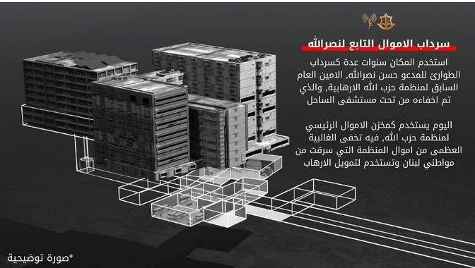 وقال: "نود التنويه مع التشديد، إلى أن المدخل قد يكون مخفيًّا باستخدام وسائل متعددة، مما قد يصعب العثور عليه. ندعوكم لاستكشاف الموقع الذي يحتفظ فيه حزب الله بأموال تعود إلى الشعب اللبناني".