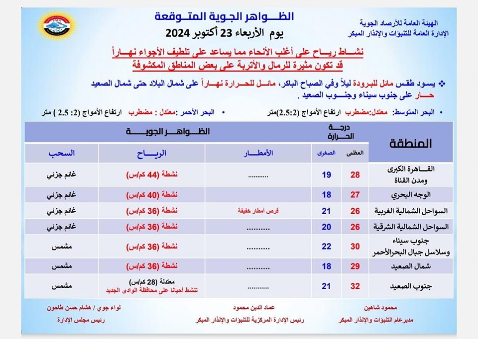 كما أشارت هيئة الأرصاد الجوية إلى فرص لسقوط الأمطار الخفيفة اليوم الأربعاء 23 أكتوبر وغدًا الخميس 24 أكتوبر على مناطق من السواحل الشمالية الغربية.