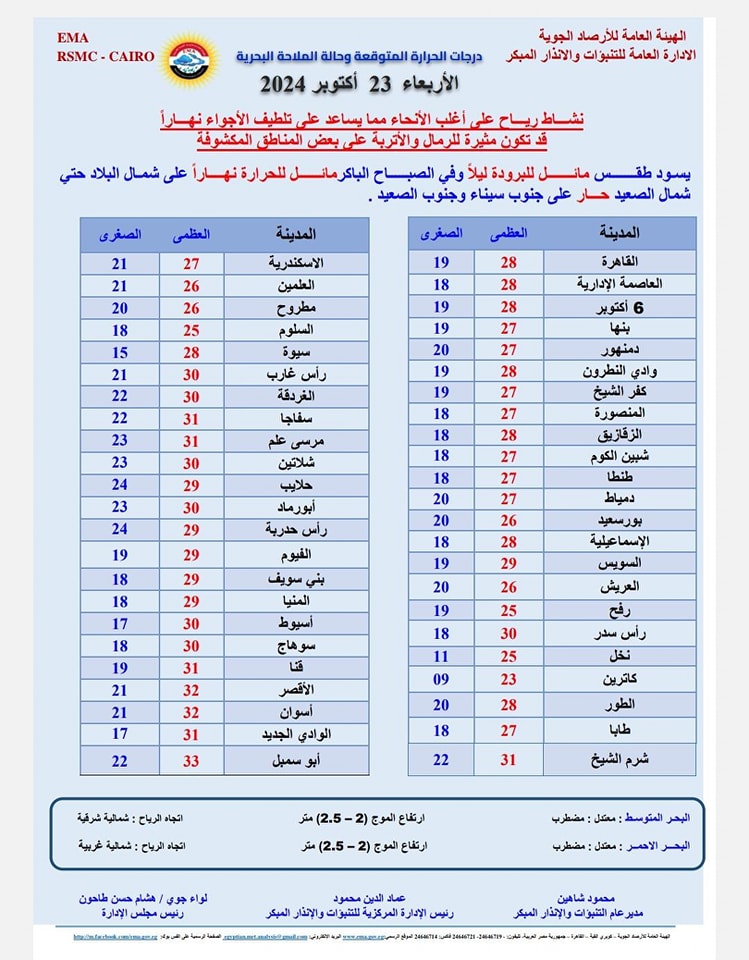 أما عن حالة البحرين أوضحت أن حالة البحر المتوسط من معتدل إلى مضطرب وارتفاع الموج (2: 2.5)، اتجاه الرياح شمالية شرقية، والبحر الأحمر معتدل إلى مضطرب وارتفاع الموج (2: 2.5)، اتجاه الرياح شمالية غربية.