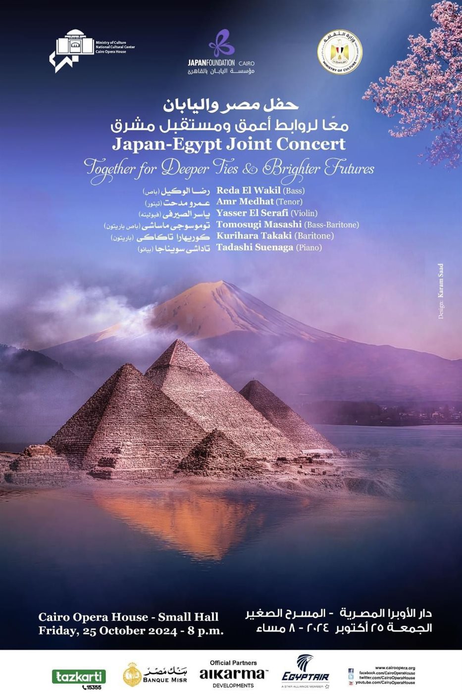 تنظم دار الأوبرا المصرية برئاسة الدكتورة لمياء زايد وبالتعاون مع مؤسسة اليابان بالقاهرة حفل بعنوان "مصر واليابان معا لروابط أعمق ومستقبل مشرق "، بمشاركة نجوم العزف والغناء الأوبرالي فى البلدين.