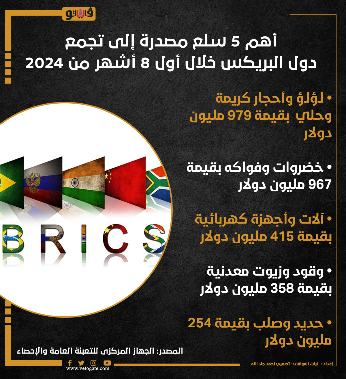 أهم 5 سلع مصدرة إلى تجمع دول البريكس خلال أول 8 أشهر من 2024 (إنفوجراف) الأربعاء 23/أكتوبر/2024 - 07:06 م 10/23/2024 7:06:38 PM البريكس آيات الموافى شارك طباعة 18 حجم الخط شارك طباعة أحجار كريمة الجهاز المركزى للتعبئة العامة والإحصاء خضروات وفواكه