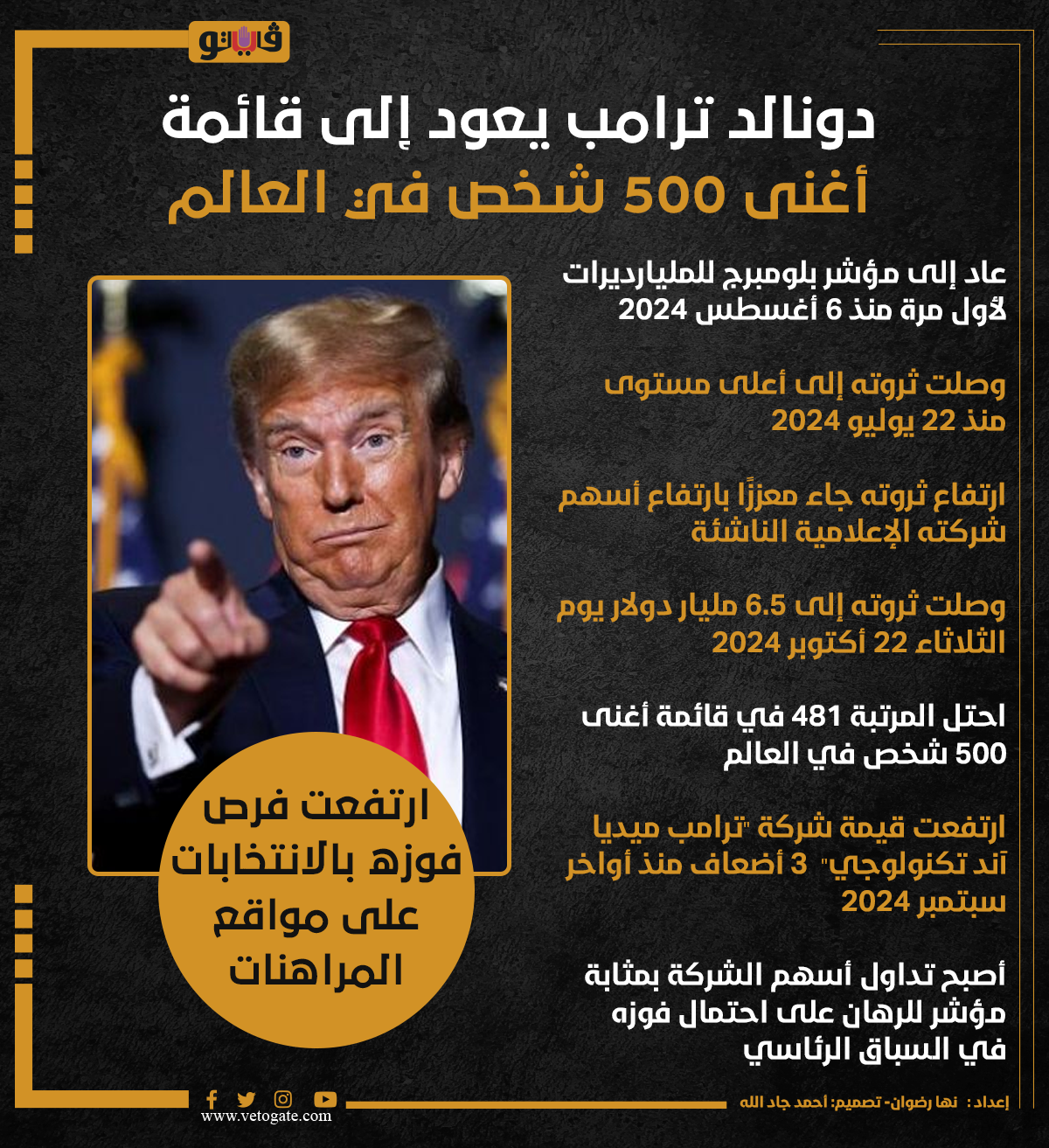 دونالد ترامب يعود إلى قائمة أغنى 500 شخص في العالم (إنفوجراف) الأربعاء 23/أكتوبر/2024 - 07:06 م 10/23/2024 7:06:58 PM دونالد ترامب، فيتو نها رضوان شارك طباعة 18 حجم الخط شارك طباعة الرئيس الأميركي أغنى 500 شخص في العالم دونالد ترامب قائمة أغنى 500 شخص في العالم مؤشر بلومبرغ مواقع المراهنات