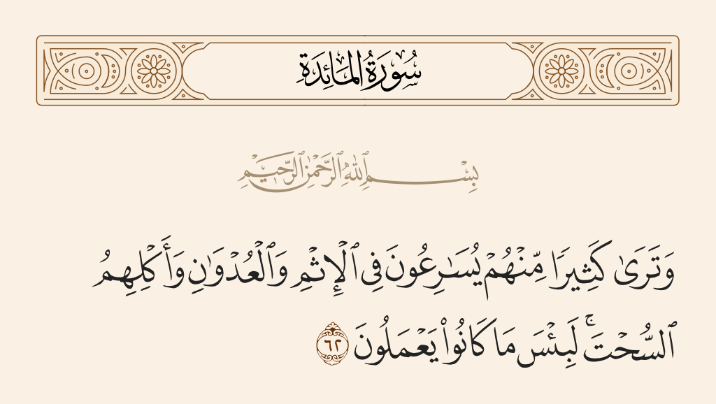 قال تعالى: «وَتَرَى كَثِيرًا مِنْهُمْ يُسَارِعُونَ فِي الْإِثْمِ وَالْعُدْوَانِ وَأَكْلِهِمُ السُّحْتَ لَبِئْسَ مَا كَانُوا يَعْمَلُونَ».
