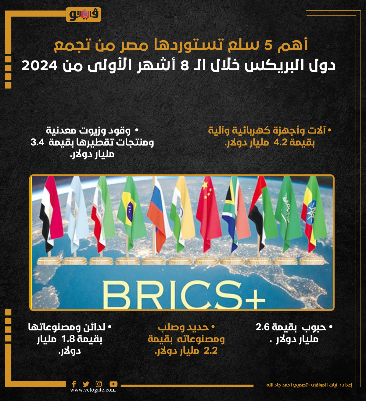 أهم 5 سلع تستوردها مصر من تجمع دول البريكس خلال الـ 8 أشهر الأولى من 2024 (إنفوجراف) الأربعاء 23/أكتوبر/2024 - 06:54 م 10/23/2024 6:54:29 PM البريكس آيات الموافى شارك طباعة 18 حجم الخط شارك طباعة الجهاز المركزى للتعبئة العامة والإحصاء حبوب لدائن