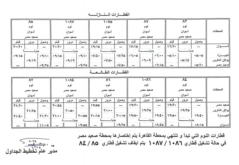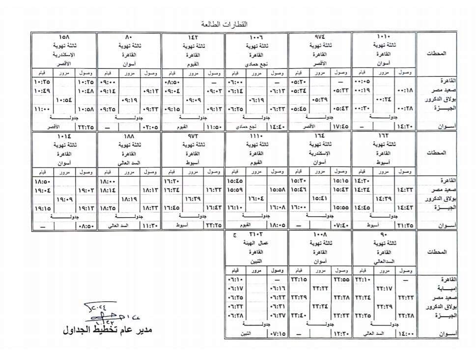 كما تقرر إعتبارًا من يوم ٢٠٢٤/١١/١ يتم وقوف جميع قطارات الثالثة التهوية الديناميكية الشغالة ما بين القاهرة وأسوان وبالعكس بمحطة صعيد مصر.
