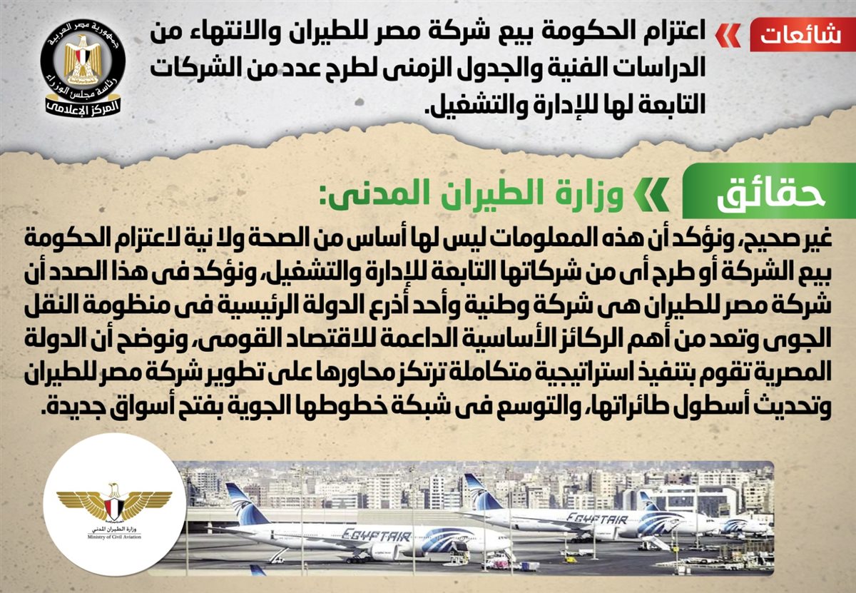 وتواصل المركز الإعلامي لمجلس الوزراء مع وزارة الطيران المدني، والتي نفت تلك الأنباء، مُؤكدةً أن هذه المعلومات ليس لها أساس من الصحة ولا نية لاعتزام الحكومة بيع الشركة أو طرح أي من شركاتها التابعة للإدارة والتشغيل.