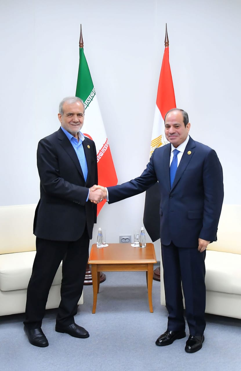 كما التقى الرئيس عبد الفتاح السيسي مع الرئيس الإيراني "مسعود بزشكيان"، على هامش قمة تجمع البريكس المنعقدة بمدينة قازان في روسيا الاتحادية.