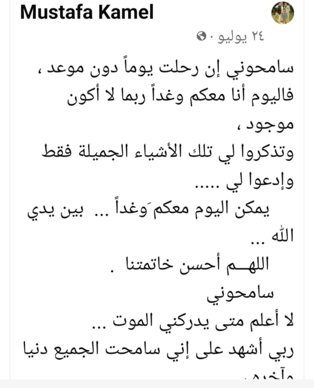 وأضاف مصطفى في منشوره: "اللهم أحسن خاتمتنا.. سامحوني، لا أعلم متى يدركني الموت، ربي أشهد أنني سامحت الجميع دنيا وآخرة.. قد أكون في يوم من الأيام قد اغتبت أحدًا أو أسأت إلى أحد بزلة لسان أو في نفسي، أو مع جماعة عن قصد أو بدون قصد، أو أخطأت بحق أحد".