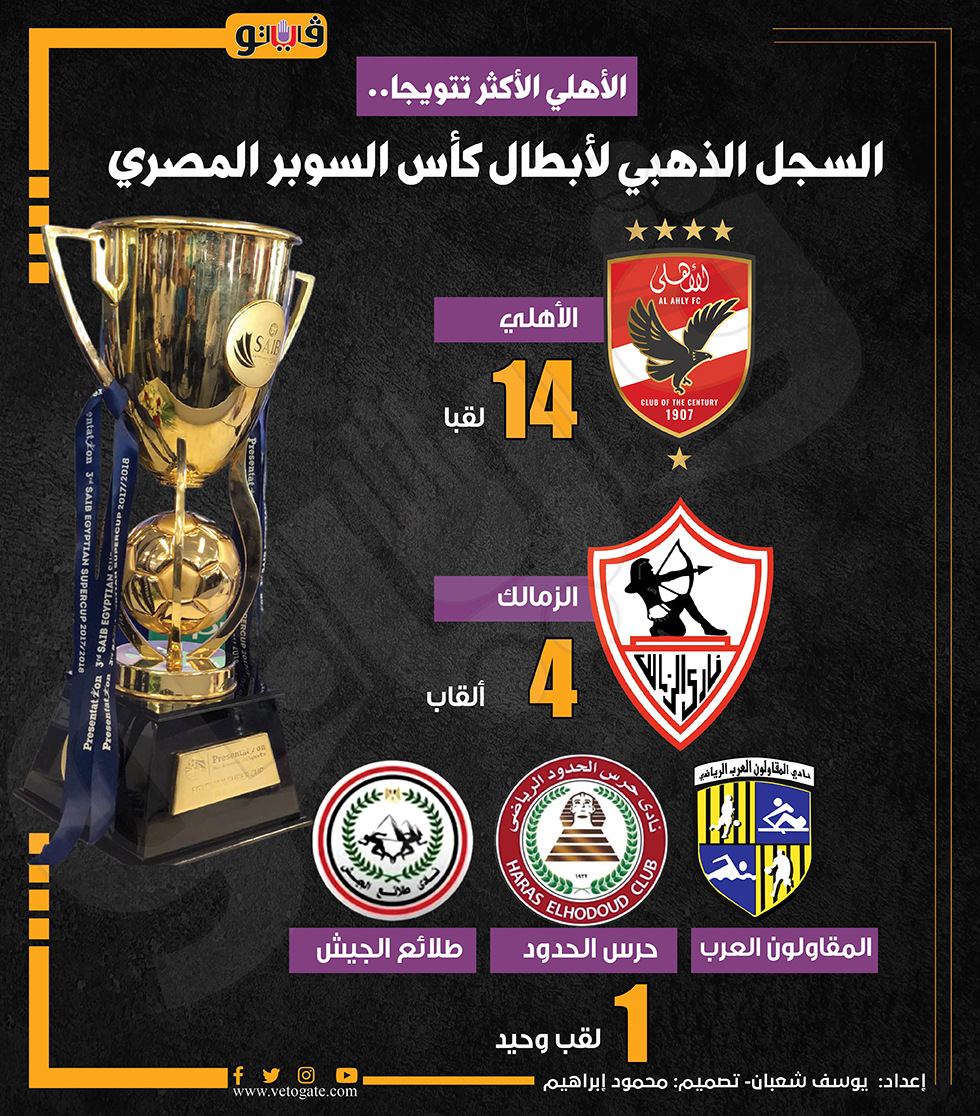 الأهلي الأكثر تتويجًا..السجل الذهبي لأبطال كأس السوبر المصري (إنفوجراف) الخميس 24/أكتوبر/2024 - 12:09 م 10/24/2024 12:09:17 PM الأهلي الأكثر تتويجًا بالسوبر المصري، فيتو يوسف شعبان شارك طباعة 18 حجم الخط شارك طباعة كأس السوبر المصري الأهلي الزمالك المقاولون العرب حرس الحدود طلائع الجيش