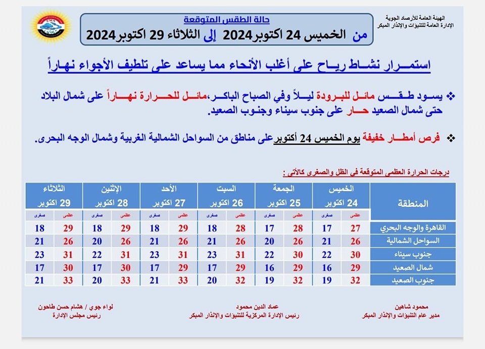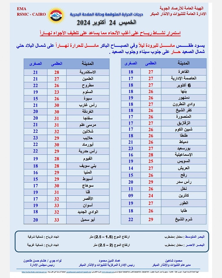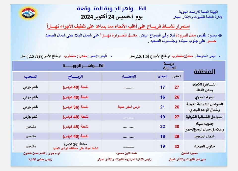 ونشرت هيئة الأرصاد الجوية بيانا بدرجات الحرارة المتوقعة اليوم الخميس، وجاء كالتالي: