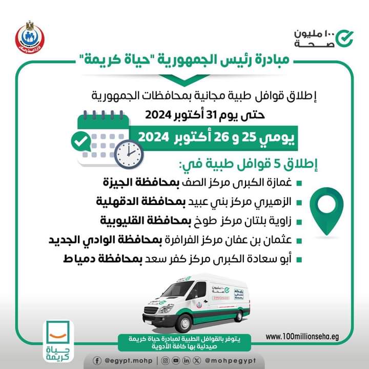 أعلنت وزارة الصحة إطلاق ٥ قوافل طبية قافلة طبية ضمن مبادرة رئيس الجمهورية حياة كريمة يومي ٢٥ و٢٦ أكتوبر للكشف والعلاج مجانًا في التخصصات الطبية نساء وولادة - خدمات تنظيم الأسرة - الأطفال والباطنة - الأنف والأذن- العظام - الجراحة - الرمد الأسنان - القلب - الجلدية وخدمات الأشعة والتحاليل.