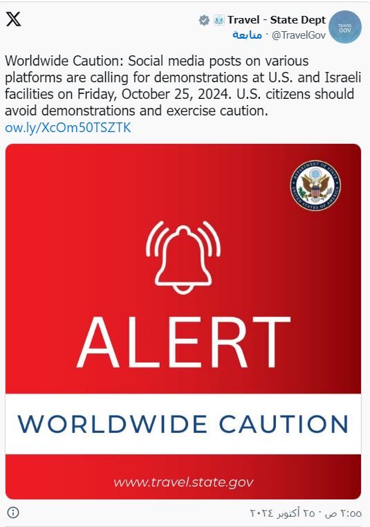 وذكرت وزارة الخارجية الأمريكية، أن التحذير الذي أصدرته جاء بعد منشورات في مختلف منصات التواصل الاجتماعي تدعو إلى التظاهر قرب منشآت أمريكية وإسرائيلية، اليوم الجمعة، 25 أكتوبر 2024.