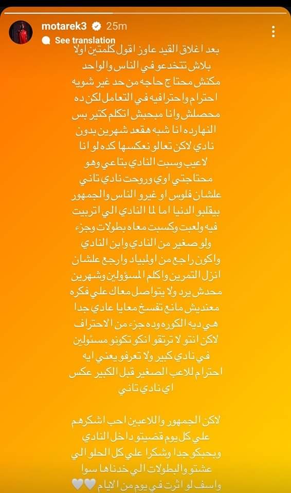 وكتب محمد طارق لاعب الزمالك عبر صفحته الرسمية على إنستجرام: بعد إغلاق باب القيد كنت محتاج احترافية واحترام في التعامل من إدارة الزمالك أنا شبه هقعد شهرين بدون نادي.