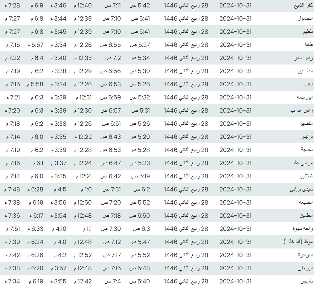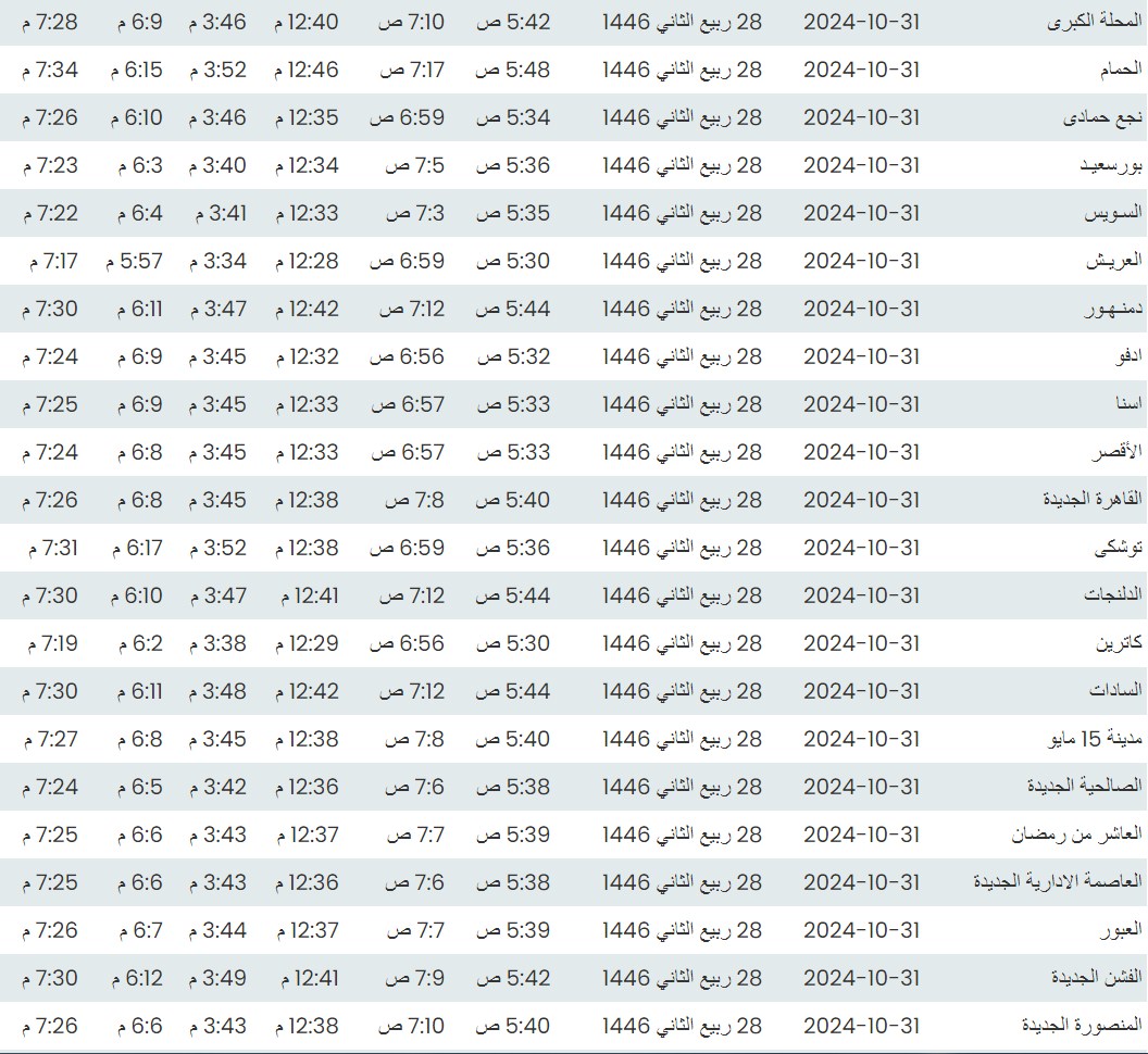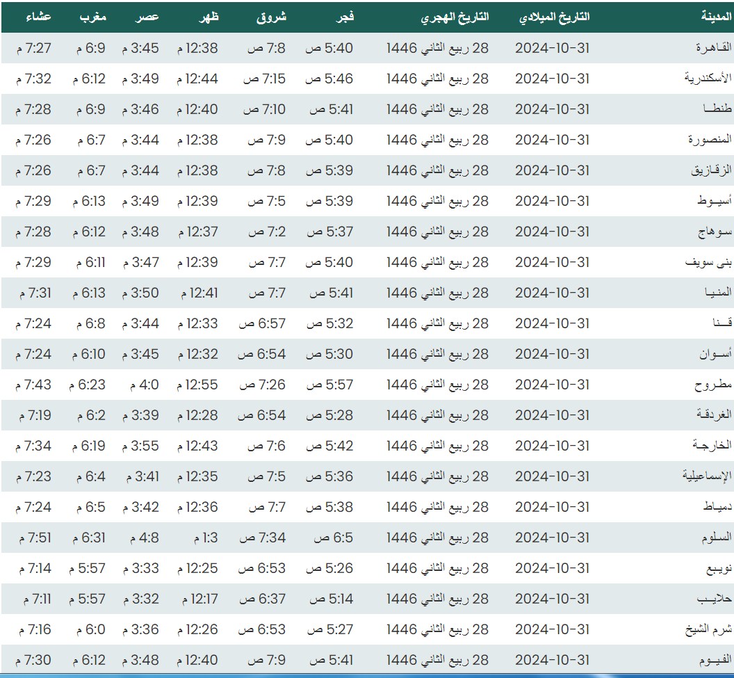 وفيما يلي مواقيت الصلاة، لعدد من مدن ومحافظات الجمهورية من واقع بيانات الهيئة العامة للمساحة