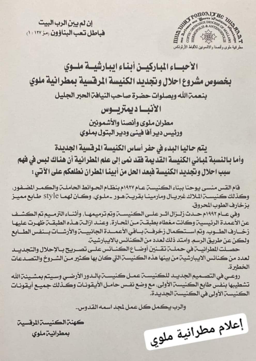 وورد في نص البيان: "إلى الأحباء أبناء إيبارشية ملوي، نود أن نلفت انتباهكم إلى مشروع إحلال وتجديد الكنيسة المرقسية، حيث بدأت أعمال حفر أساس الكنيسة الجديدة، وقد لفت انتباه المطرانية أن هناك بعض الالتباسات حول أسباب هذا الإجراء."