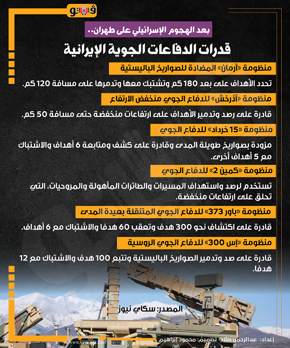 بعد الهجوم الإسرائيلي على طهران.. قدرات الدفاعات الجوية الإيرانية (إنفوجراف) السبت 26/أكتوبر/2024 - 02:42 م 10/26/2024 2:42:21 PM الدفاعات الجوية الإيرانية، فيتو عبدالرحمن صلاح شارك طباعة 18 حجم الخط شارك طباعة الدفاعات الجوية الإيرانية قدرات الدفاعات الجوية الإيرانية إيران طهران إسرائيل الهجوم الإسرائيلي على إيران